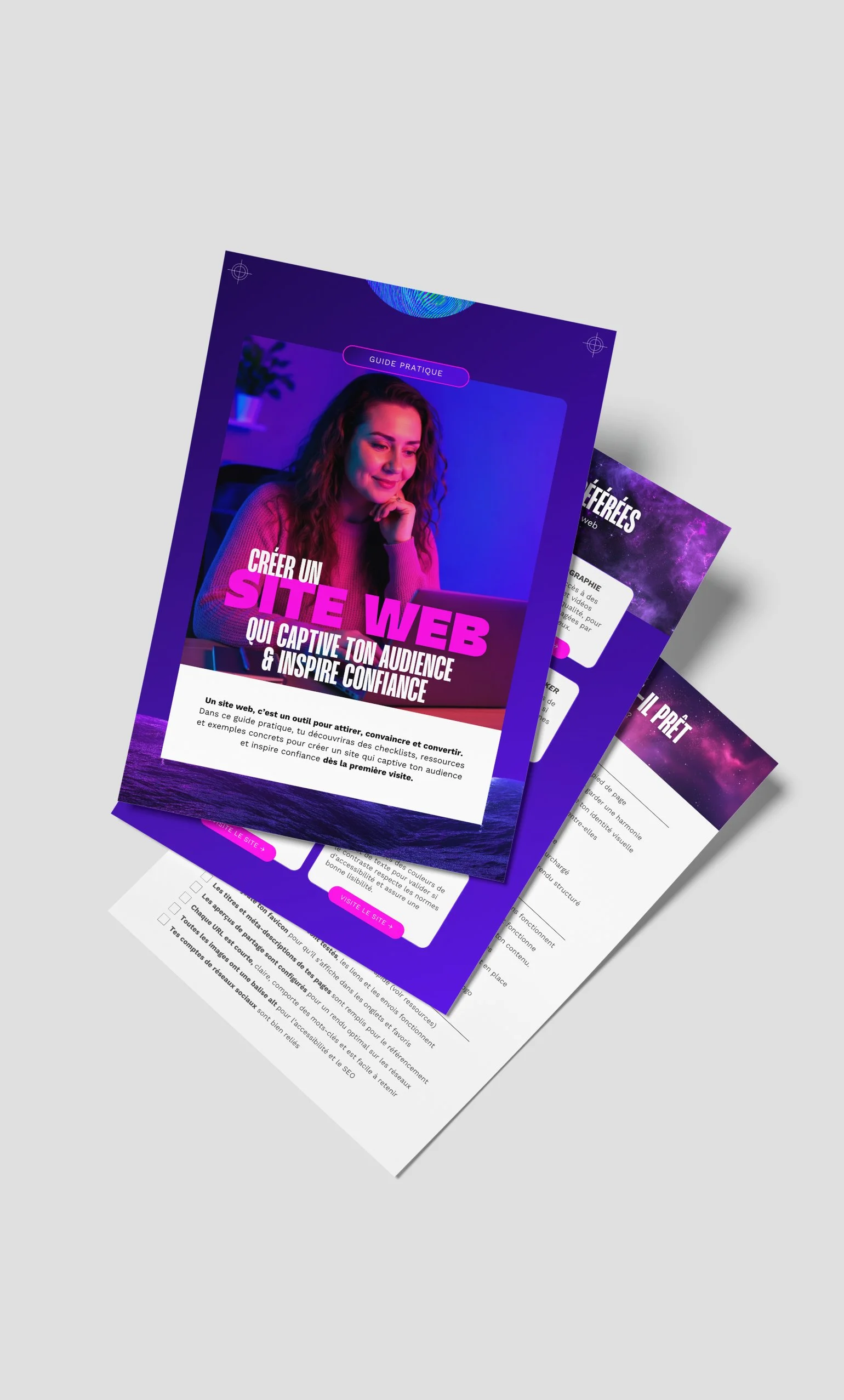 Je m’occupe de tout le look de ton site : photos, icônes, textures, fonds, éléments graphiques… Chaque détail est pensé pour refléter ton univers et ton professionnalisme, en parfaite cohérence avec ton identité visuelle.